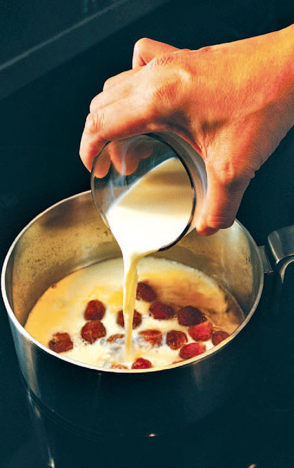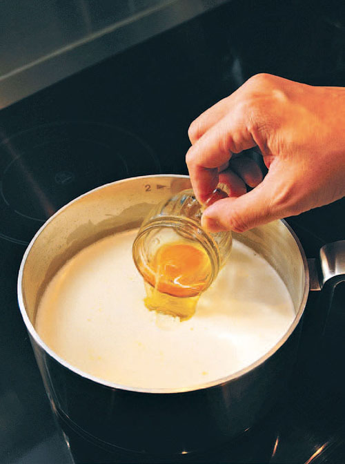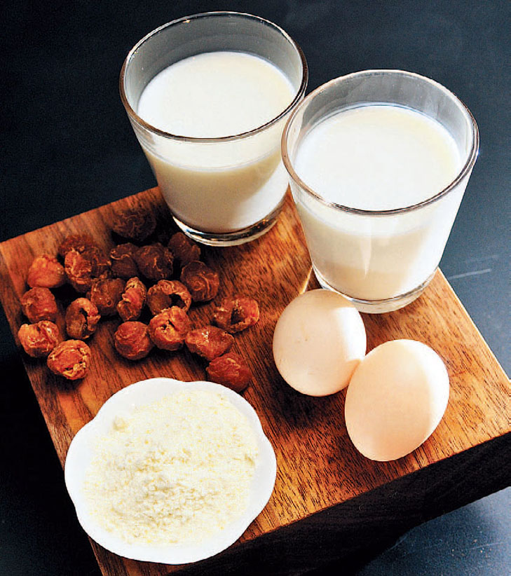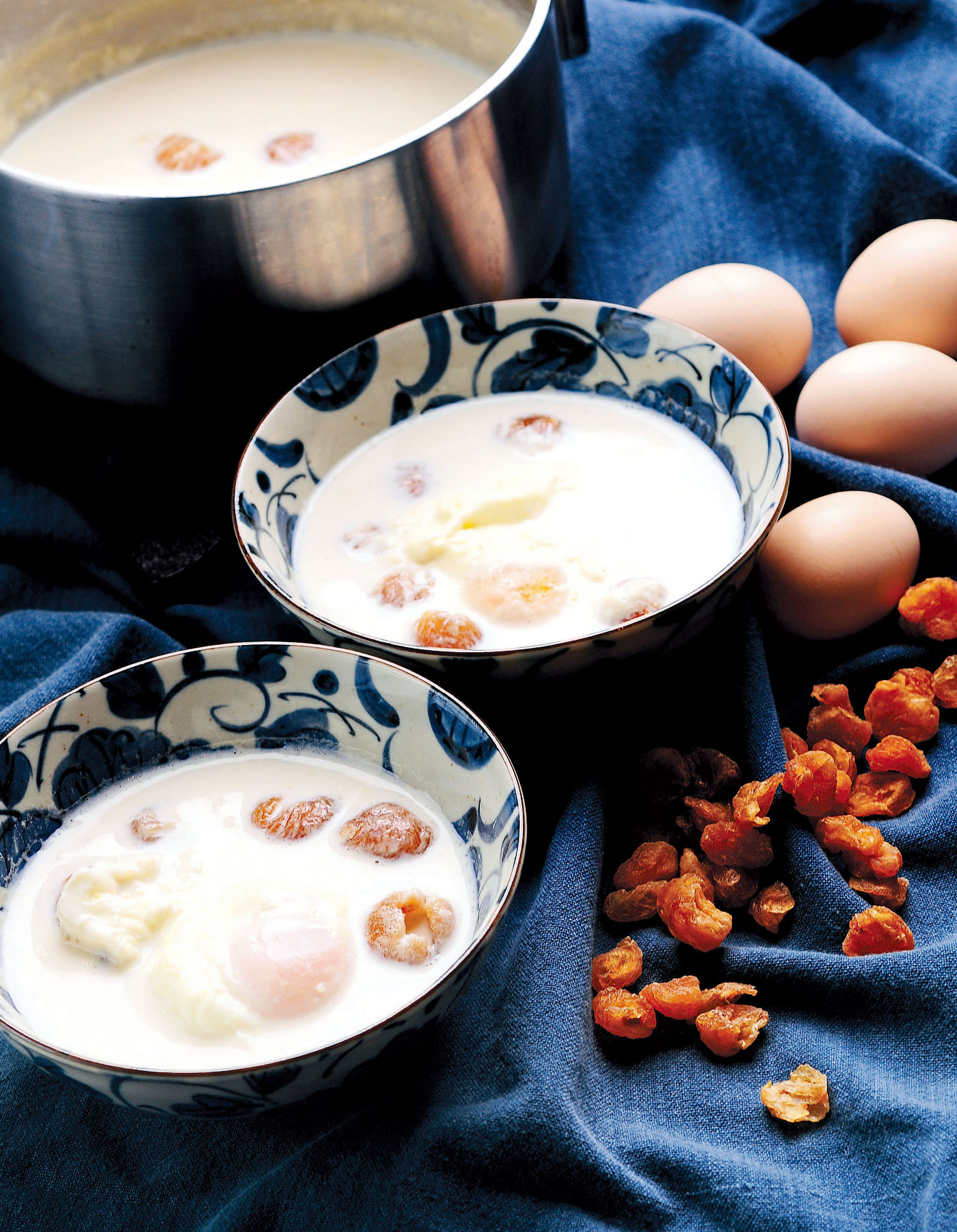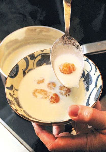 6.趁鸡蛋还是溏心时轻轻盛入碗中,与桂圆、杏仁粉、牛奶的搭配简直是无比温暖的天作之合。(一分钟)