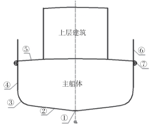 ①龙骨 ②底板 ③舭部 ④舷侧 ⑤甲板 ⑥舷墙 ⑦护舷材