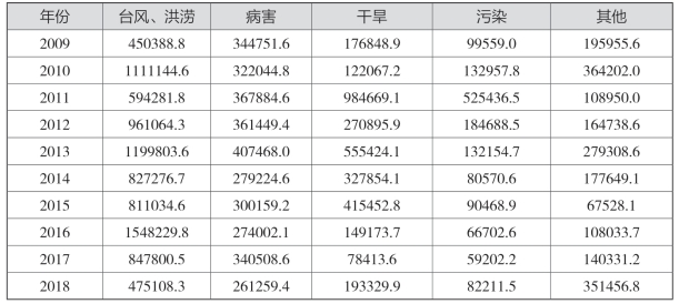 我国渔业船舶水上安全事故发生与我国沿海的气候特征和春节期间停船、伏季休渔的特点相吻合。近年来我国渔业船舶水上安全事故有所下降,但是,全国渔业安全基础薄弱、安全监管和安全责任落实未到位的现象仍然存在,渔业安全隐患、影响和制约渔船安全的因素仍未解决,加之极端和灾害天气的突发性、不可预知性,这些都增加了渔业安全事故发生的不确定性。我国渔业因灾情造成的经济损失见表3-1。