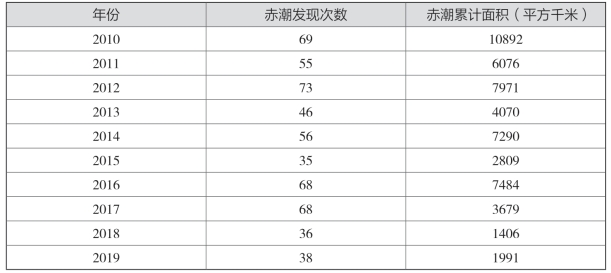 表3-2 2010 —2019 年我国海域赤潮发现次数和累计面积