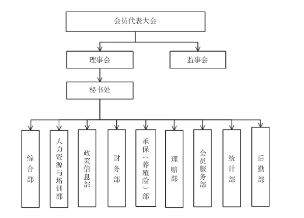 会员代表大会是最高权力机构,拥有制定和修改章程、选举和罢免理事监事、决定终止和其他重大事宜的权力。理事会是会员代表大会选举产生的决策机构,在会员代表大会闭会期间领导协会开展工作,对会员代表大会负责。监事会是会员代表大会选举产生的监督机构,依照国家法律、行政法规和章程的有关规定,以财务监督为核心,对协会的财务活动及理事会的决策程序、秘书处的业务管理行为进行监督,以保证会员权益不受损害,对会员代表大会负责。秘书处作为理事会下设的日常办事机构,下设综合部、人力资源和培训部、政策信息部、财务部、承保(养殖险)部、理赔部、会员服务部、统计部和后勤部9个部门。