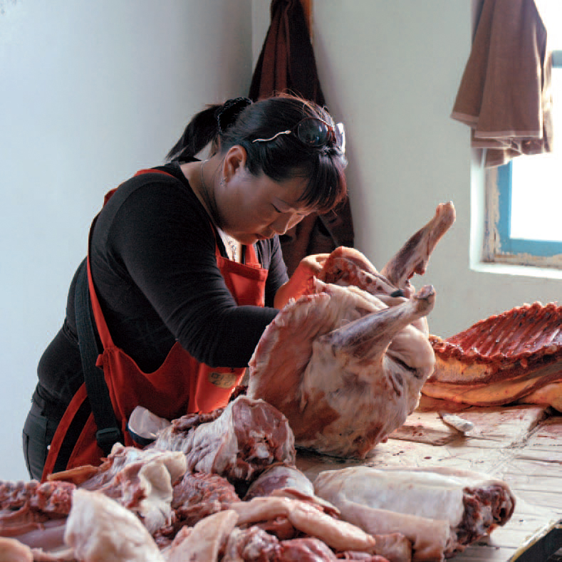 厨师和司机去买羊肉,跟我们设想并不一样,蒙古草原虽说是牧区,却并不能随时随地买到羊只,牧民们据说并不随便出售羊,有钱也不行,只有在集市上才能买到。和林市场上肉铺中挂着几只红红的羊,看样子有几天了。农业民族对蒙古人所谓膻肉酪浆习俗的误会由来已久。清代学者赵翼在一本笔记《檐曝杂记》中讲这样一件事,他曾问及蒙古人吃肉的习俗。这位蒙古人告诉他:经常吃肉那是王公贵族的事情,我们这些穷人也只在逢年过节时才杀一只羊,杀羊也是数户轮流坐庄,每户分割一点。这就是每年可以食肉时候。寻常度日,靠的是牛奶马乳。