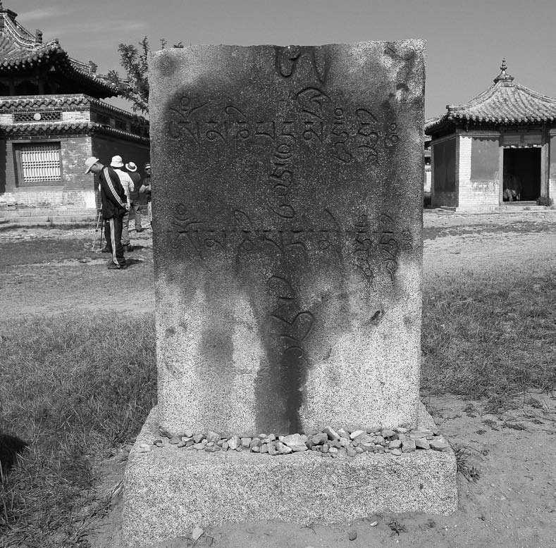 道路左侧竖立着几块碑石,走近观察,石碑是旧的,隐约可见上面原有阿拉伯文,覆盖在上的是藏文六字真言。另一块较完整的石碑,阿拉伯文清晰可见,只是正中深深地雕刻蒙古索布云图案。索布云图案,在蒙古是最重要的图形,由太阳、月亮、阴阳太极等内容组成,被放置在蒙古国旗上。敖其尔说,石碑是元代的,阿拉伯文记载,是由穆斯林商人出资修建穆斯林学堂,原来放在哈拉和林旧城,额尔德尼召修建时,大量石碑被移到这里,改作他用。13世纪鲁不鲁乞游记中记载,在整个哈拉和林城中,有十二座异教徒的庙宇,由各种不同的民族供奉,其中有两座伊斯兰教寺院,一座基督教的教堂。伊斯兰教的寺院,当然就是清真寺,敖其尔所说的穆斯林学堂,大概也指的是经学院。