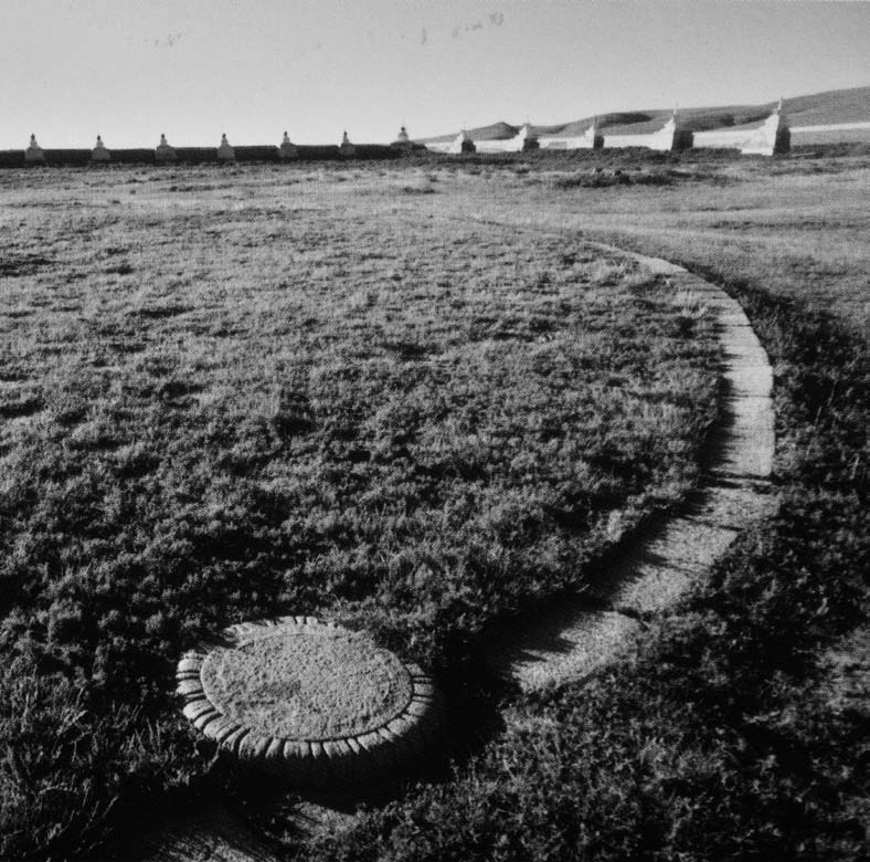 额尔德尼召东北,是一大片空地,上有一蒙古包的遗址。按说蒙古包并不会有遗址留存,移动的蒙古包拆除后,荡然无存。可是,额尔德尼召确实有蒙古包的基址,这个蒙古包实在太大了,据说是蒙古国最大的蒙古包。