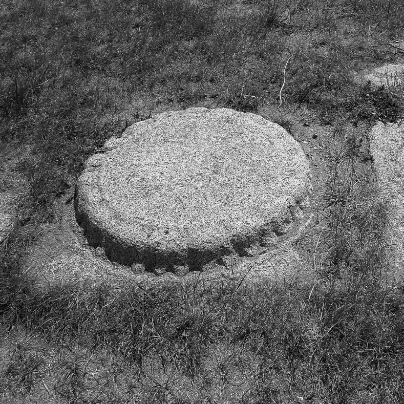 石围圈的中央,分布着七个柱础石,中央左右两个,北面则有五个,分作两排。从对称的原则来说,石础并非原有数量。石础分三种,A.正方形,50厘米×50厘米,80厘米×80厘米,中间有一穿洞,直径分别为20—30厘米,厚20厘米。B.正方形,70厘米×70厘米,中央凸起约5厘米,刻一槽,中间穿孔直径30厘米;C.正方形,70厘米×70厘米,中央亦凸起,边稍宽约有5厘米,素面,中间洞直径35厘米。