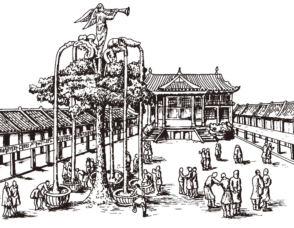 13世纪欧洲大陆的宴会发生了一些重大变化,餐桌上最重要的展品由原来的精制的金银餐具,变成了所谓的餐桌喷泉。它们能让液体、酒水流动,喷射而出,借着水的压力又让其他东西动作起来,铃铛响起。巧夺天工的机关,使第一次看到的人目瞪口呆。这些能工巧匠也来到蒙古帝国,马可·波罗也记录了忽必烈王宫的类似装置: