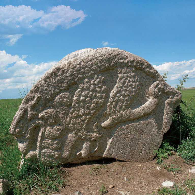 这就是著名的九姓回鹘可汗碑,在北纬47°18′685″,东经102°40′388″,海拔1499米处。费志尼的蒙古时代就见过这块大碑。19世纪70年代俄国学者雅德林采夫(N.Yadrintsev)发现九姓可汗碑时,九姓可汗碑碑身已破碎为若干块,余下来的如今散落在方圆几十米的草丛中,大小共有十六块。