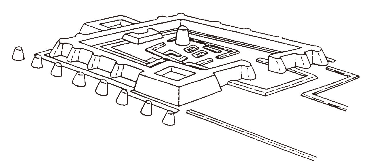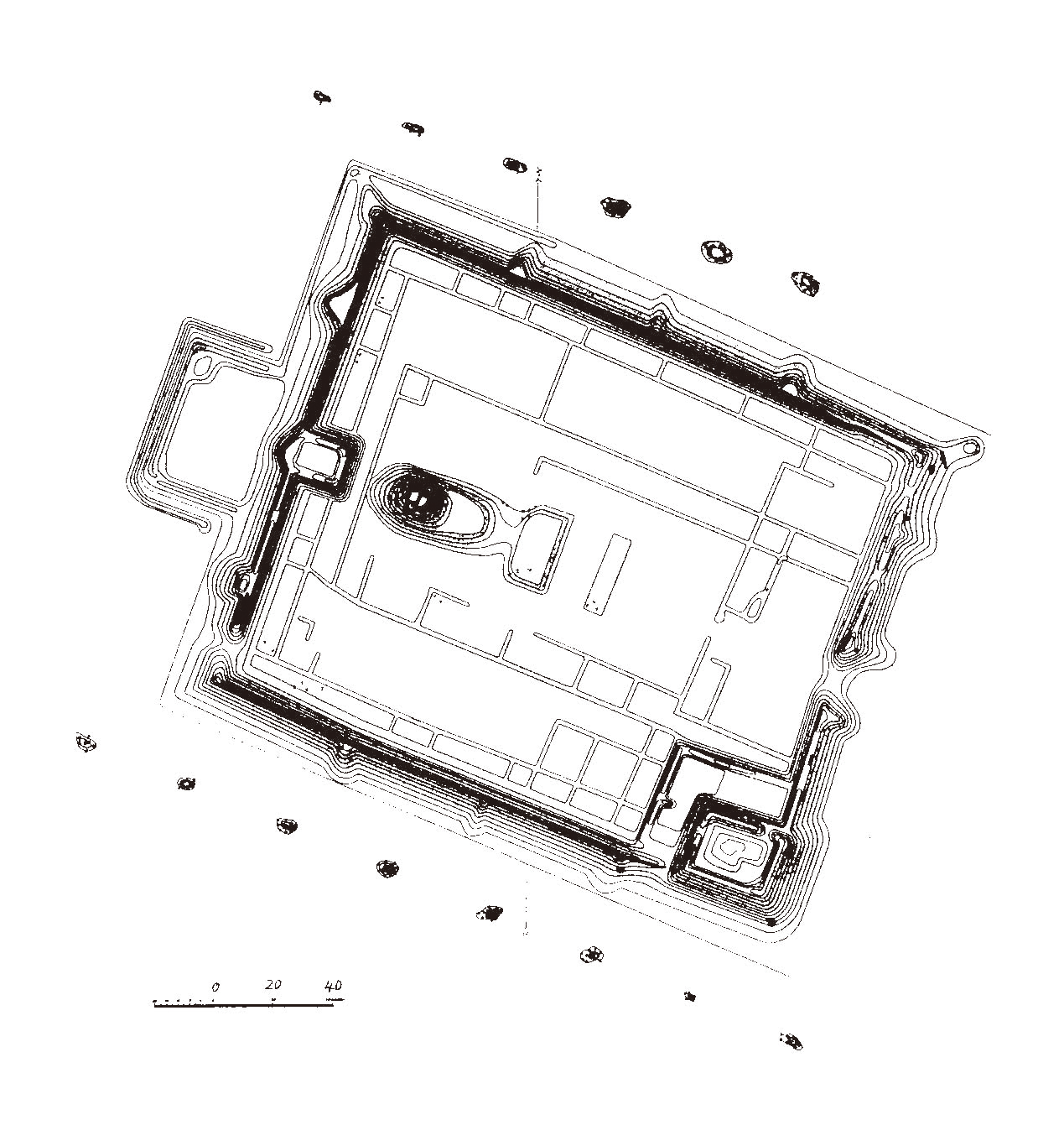 在距南墙15米处有一条长条形凹地,是护城河,护城河宽也有15米左右。