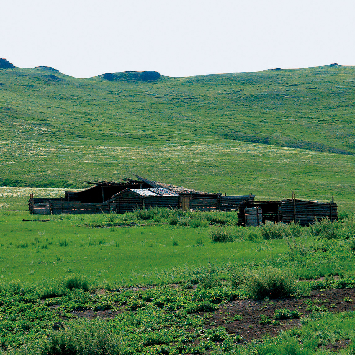 车在一高阜的地方停住。寂静的山谷,只有我们孤零零的几车、几人,显得异常空旷。左面的山坡上,有一座白屋,大山谷中到底住着什么样的人家?好奇心引导着我们几个走向前去。木板搭建的屋子在阳光照耀下泛着白色,周边用木栅栏围起,小心翼翼地喊了几声,无人应答,照例蒙古人家一般都养狗。缓坡上约有半亩菜园,绿油油的草地上,稍有开垦显得非常刺眼。园中种着几种蔬菜,有土豆、萝卜等,疏于打理,杂草丛生。园子中央堆着一堆石块,看样子是人工堆就。附近的蝗虫满地,人停脚踩,轰然而起,随即降落,并不远飞,复进亦然。