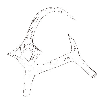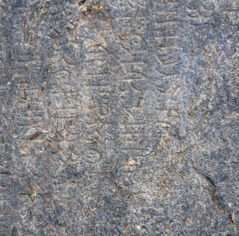 不像大多数的汉碑,碑额与碑身分别制作,最后用榫卯结构联结,毗伽可汗碑用一整块巨石制成,碑额也是四条螭龙缠绕。不过,因年代久远,龙身细节已不清楚,只有大形还在。碑额正中有一图案,是简化的鹿形,专业术语称为“汤姆嘎”,大概是一个部族的徽记。这类印记原本是烙在牲畜上的记号,后来发展成某一部族徽记。游牧部族在使用徽记时,大的部族或联盟采用比较简单的图案,小的部落则用复杂的图形,前者识别简洁,后者辨识起来困难。突厥用简单的鹿形可能就属于这种情况。