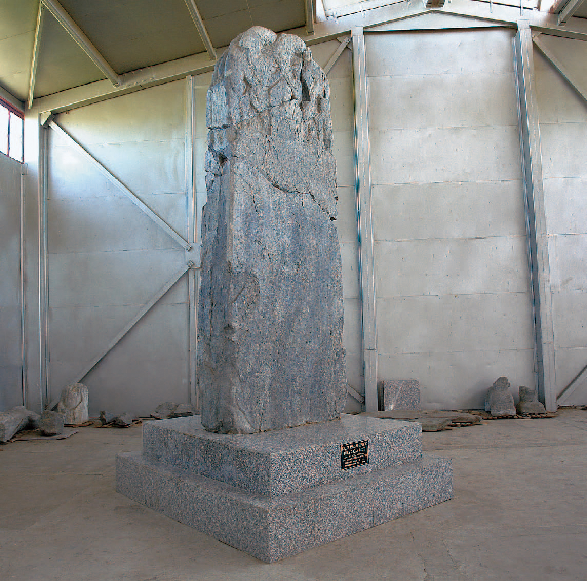 仓库位置:北纬47°33′444″,东经102°12′197″,海拔1382米。仓库用钢结构搭建,约莫有篮球场大,七八米高,靠西墙侧并排放置着石板,东侧有几个石人,西北角的地方是一块高耸的大碑,就是著名的毗伽可汗碑。