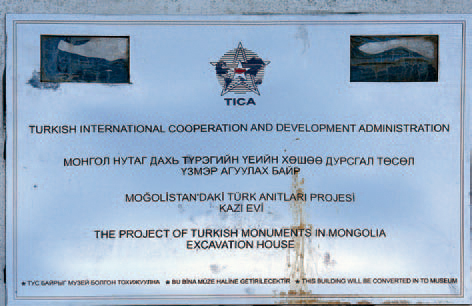 大约经一小时车程,到达毗伽可汗墓所在的和硕柴达木。先去的是孤零零竖立在草原上的一处现代建筑,被称作文物仓库。仓库门口墙上钉着一块金属牌,上面“TICA”用英、蒙两种文字标明名称。大意是土耳其国际合作与发展局古迹项目在蒙古国出土文物保护仓库。不大一会儿,来了一位身着黄色短服、头扎小辫的小姑娘,年纪五六岁,她不太熟练地用钥匙打开仓库大门,便离去了。