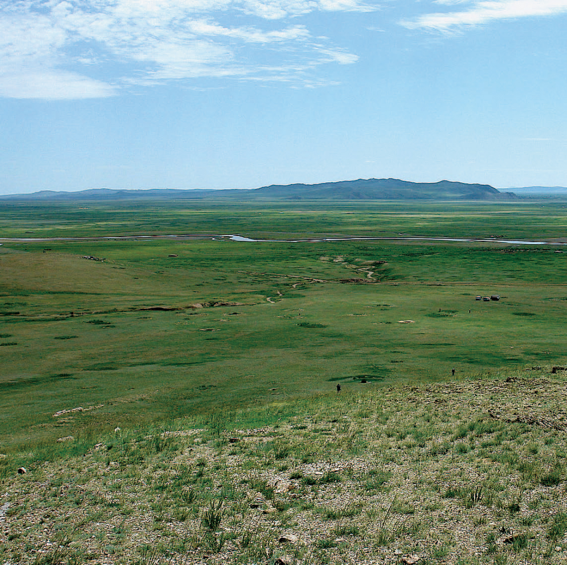 匈奴墓地及其北塔米尔河尽收眼底。蜿蜒流过的塔米尔河,似乎并不宽阔。远远望去更像一条银色的细丝带,大家都看出这条银带宛若一张弯曲的大弓,镶嵌在绿色的草原上。匈奴墓地就坐落在弯弓的曲径处,面对长河,背靠山冈,有序排列。显然是匈奴人精心挑选的地方,很可能就是匈奴人的冬营地,游牧人会将最好的草场留给冬营地,向阳避风有水源,是非常理想的地方。