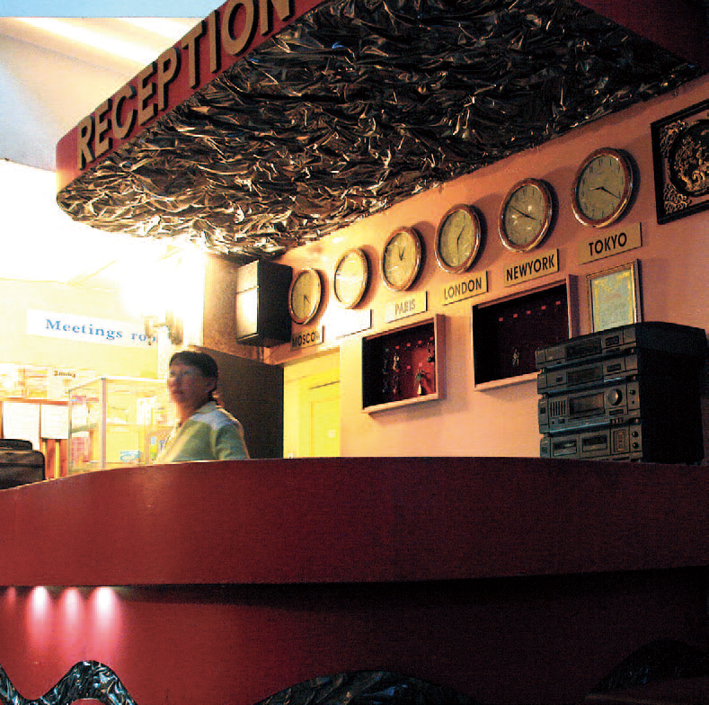 门厅也很狭小,一下子拥进二十多人,更显局促。红色柜台围起的服务台中,只有一名中年妇女,两个小柜中挂着钥匙。上面六块石英钟一字排开,显示的是世界主要城市的时间:莫斯科、柏林、巴黎、伦敦、纽约、东京,其中并没有北京时间,也从侧面反映出中国人在当地,无论是观光旅行,还是生意往来,影响都极为有限。十多年以前,即便是从中国飞往世界其他地方的飞机上的说明书,有英、法、德、日、俄甚至阿拉伯文,就是没有中文,今天飞中国的国际航班没有中文说明,则是一件不可想象的事。