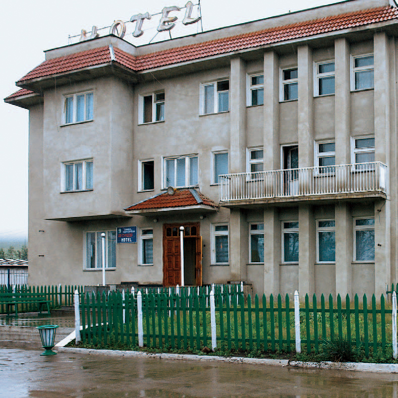 灰色的三层小楼,围在绿色的栅栏之中,楼顶竖着几个大大的字母“HOTEL”,可能是霓虹灯,门脸很小,旁边墙上钉着一块蓝色的标牌,上面有一张着大嘴的白熊标志,几行蒙文之外,英文只有饭店一词,蒙文可能是饭店的全称。