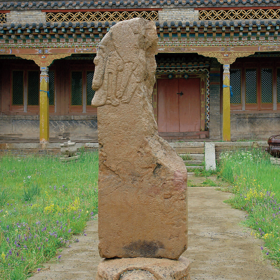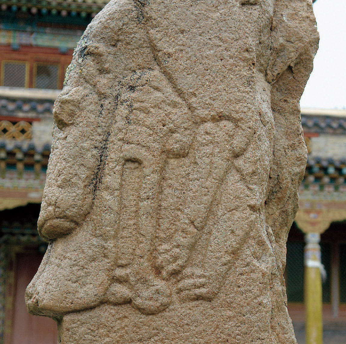 布古特碑,花岗岩质地,缺失一小半,碑额与碑身连为一体。碑额雕刻一侧面动物的形象,长嘴吐舌,口露二尖齿,长鼻圆目,前两爪先后着地,只是后半截缺失,不知全形。整体碑的造型,大体上有汉式碑的面貌,但用动物肖像作碑额,稍熟悉突厥历史的人,很容易将它与突厥传说联系起来。