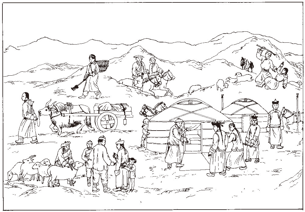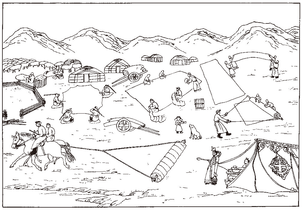 最大一幅长卷式的全景画,反映全部蒙古人的生产、生活景象。不过,从内容、人物服饰上看,画的是清朝统治下的蒙古。套马、摔跤、挤奶、拾粪、打猎、羊只交易等内容,都连续出现。除起伏的山峦、绿茵茵的草地外,喇嘛庙和喇嘛也在画面中。不过,绘画的作者想表达是清政府统治下的蒙古,头戴花翎的官员,在随从的簇拥下,被恭请进入最大的蒙古包;戴着枷锁、镣铐的犯人,在清兵的解押下休息。