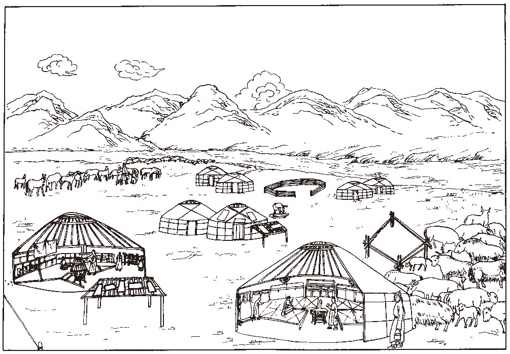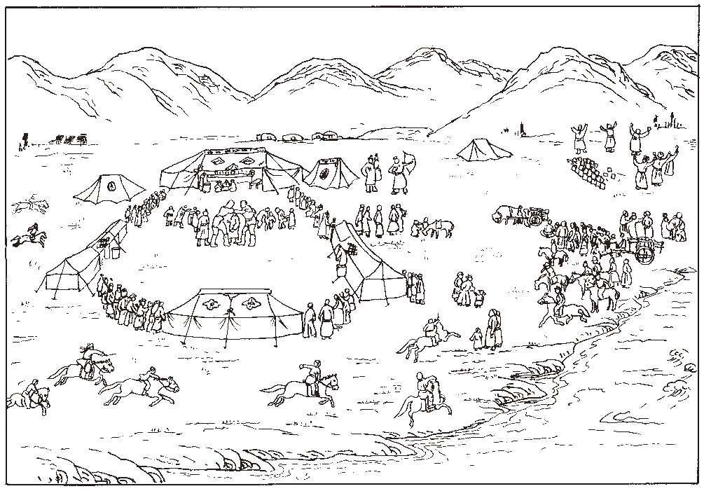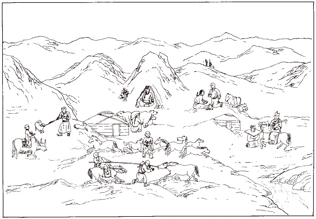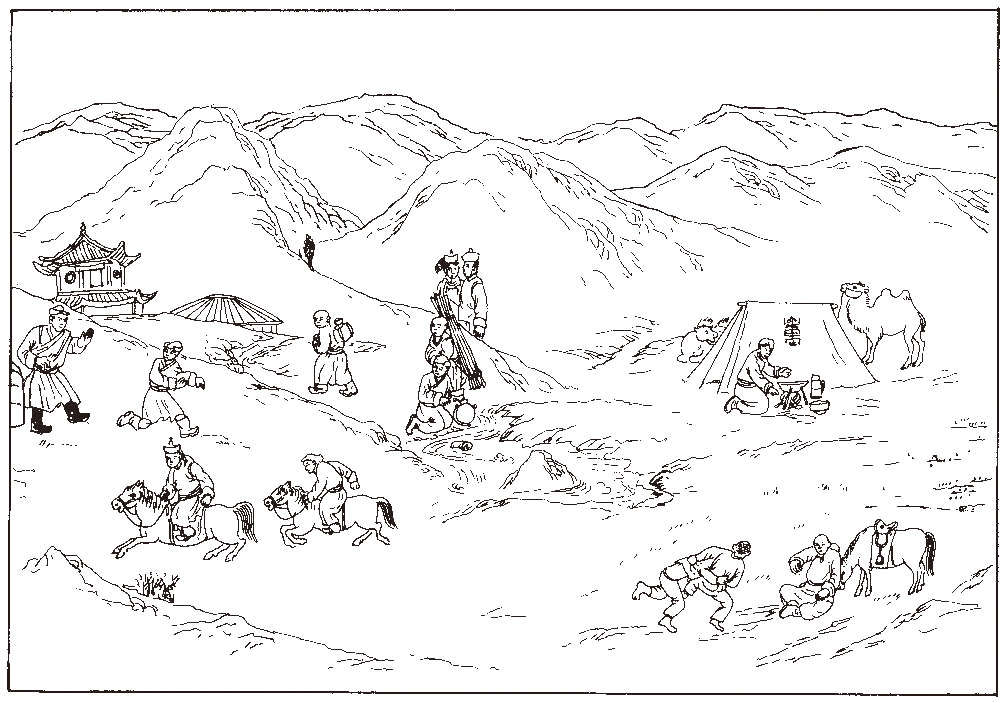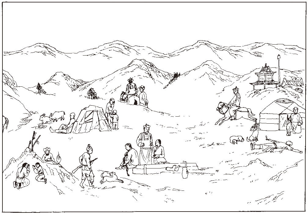 这样的全景式绘画表现方式是他所独有的,还是有所借鉴?是埋藏在我心中的一个疑问,有一天终于有答案了。数年前,我在内蒙古博物馆的文物库房中见到一幅蒙古风俗图,时代大约也是晚清,画幅尺寸很大。画面描绘的内容与《蒙古一天》如出一辙,只是更多了一些中国画的因素,如设色、人物形象。看来任何人都脱离不了时代的烙印,即所谓画有所本,这么说并不是要抹杀、降低一位伟大画家的贡献,相反,推陈出新是有基础的,画家既不泥古,又能出新者,才会开启一代画风。