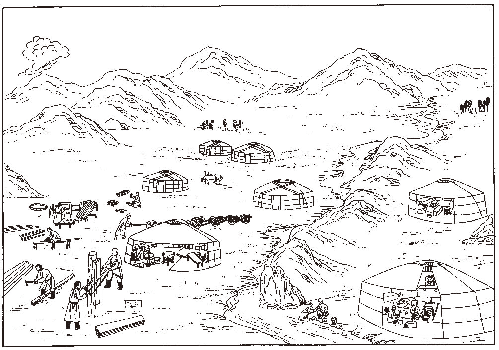 制造蒙古包,长方形画幅。远山、蓝天、白云,一条小溪从画面中间流下,左岸有人在拉锯、平木、刨木、油漆,边上有一些蒙古包的零件。好像也有一排做好的木车,包内的工匠们正在歇息,聊天。