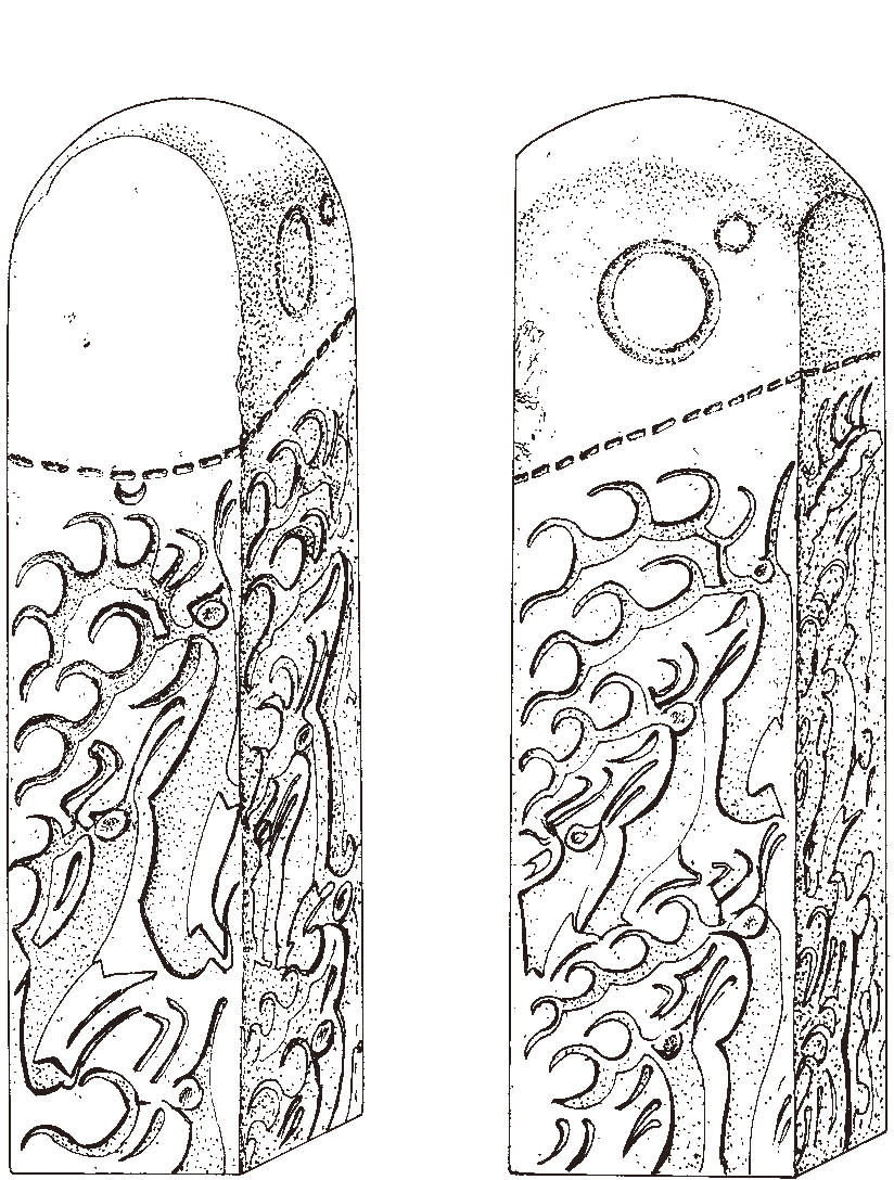 北面,上方中央刻一圆形太阳,周围有一周十分规整的光芒,太阳中有三个小坑,不知是否为原有纹饰。左上角阴刻一小圆,那就代表月亮了。一条斜线从两端穿过,分界之下,似一鹿形。两只大角占据图案中心,像涡纹。身体肌肉被分割成数块,两条细腿,蹄子尖着地。下面是一条同样身体呈蜷曲状的鹿。
