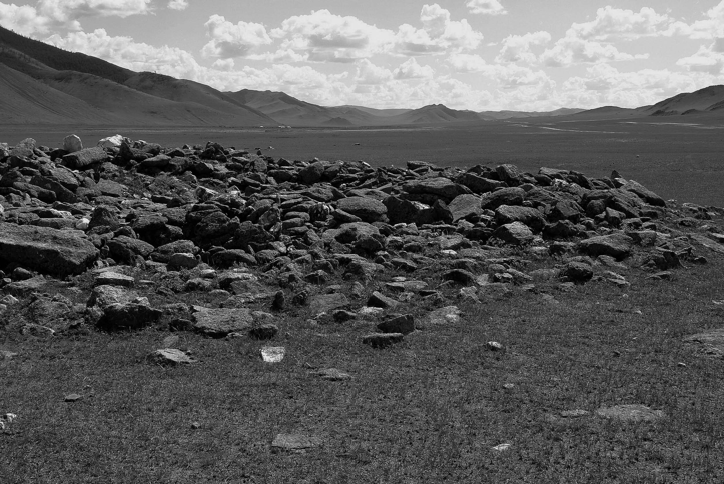 14点50分我们到达布古特碑遗址,遗址位于巴颜查干河谷,距后杭爱省会车车尔勒格有十多公里。1956年,蒙古考古学家策·道尔吉苏荣发现布古特碑,他只将布古特碑运回车车尔勒格,并没有对遗址本身进行大规模考古发掘。道尔吉苏荣调查时还发现,在布古特碑周围有六根残损的木柱,虽然木柱只留下很少的痕迹,但据此可以判定,原来布古特碑上有一亭式建筑,六角形碑亭倒塌后,砖瓦倾倒在遗址上。