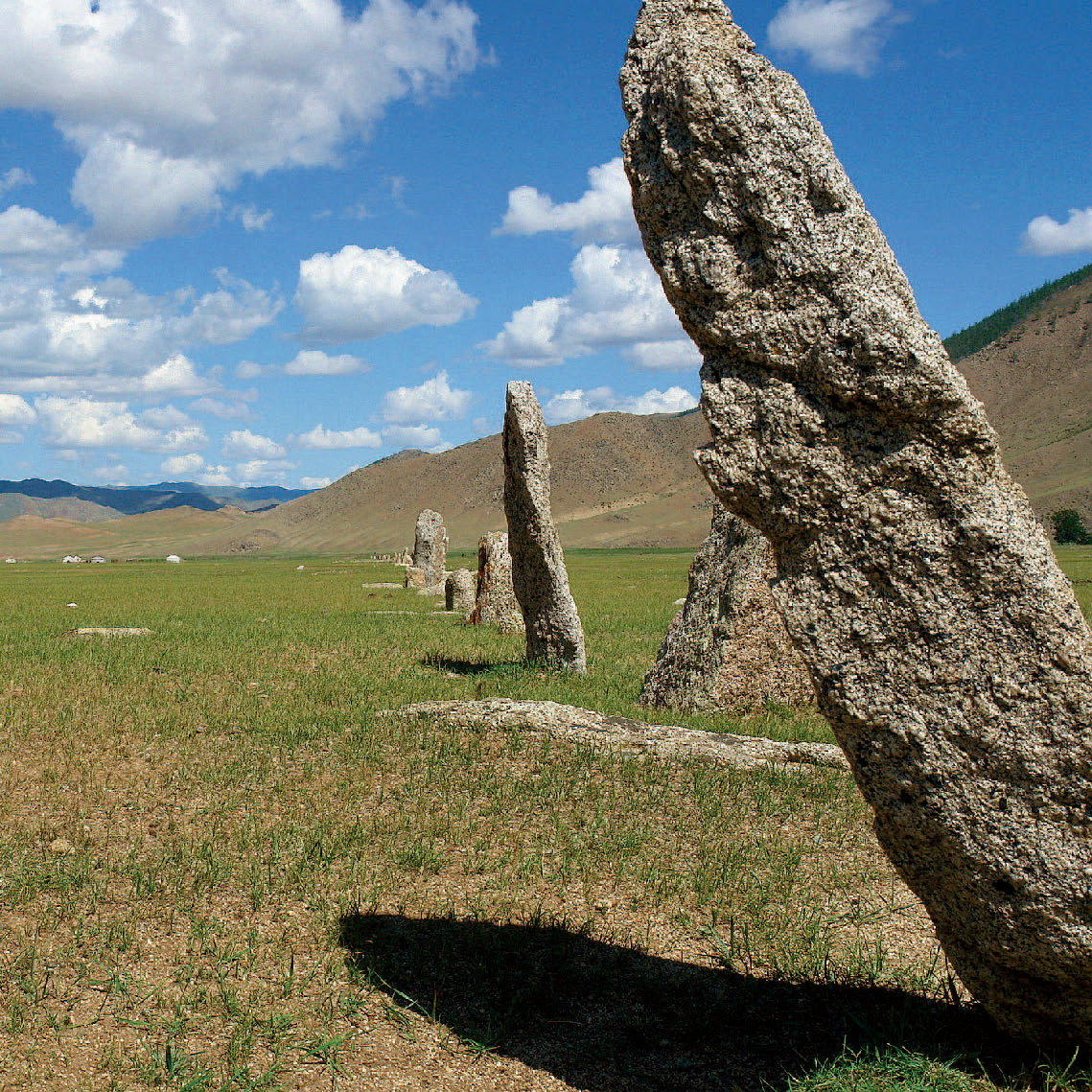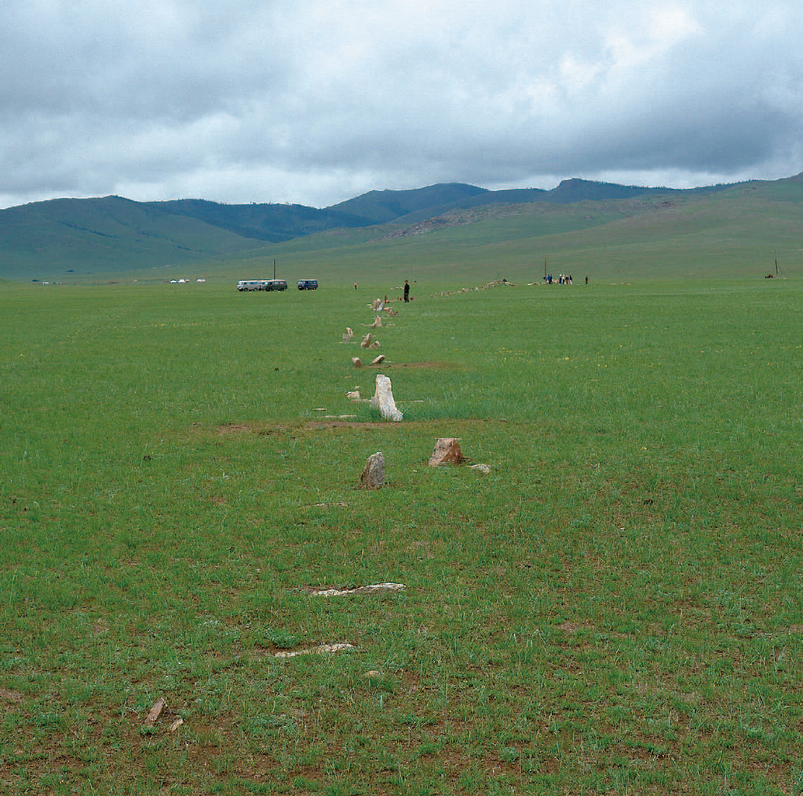 经过将近四十分钟的紧张工作,我们大体上完成了布古特遗址前杀人石数量的计数和丈量。杀人石总共有256个,长度为300米,虽然大体上向东排列,但并非直线向前,在159米处南拐去,形成一个大大的弧角。