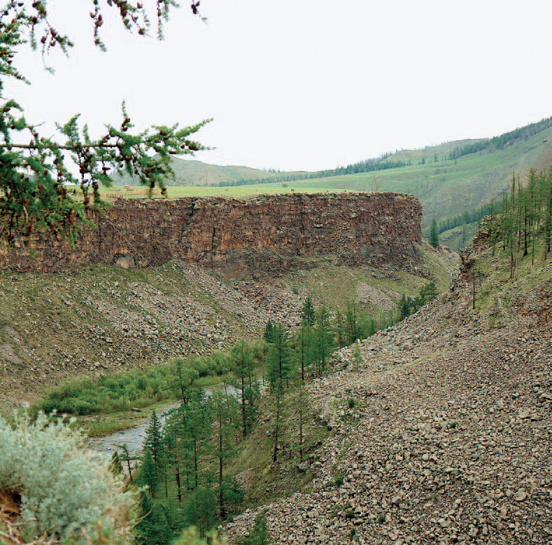 19点23分,汽车在楚鲁特高勒(Chuluut gol)峡边停下。楚鲁特,蒙语中多石的意思,属后杭爱省特里亚特苏木。峡谷两侧台地上,长满松柏,以针叶的西伯利亚松为主,谷底有溪水流过。峡谷石坡是地质时代运动形成,有的石头经多年的风雨侵蚀,像一刮风会吹落一片般的松软;有的则像人工砌成的石墙,挂在峡谷壁上。