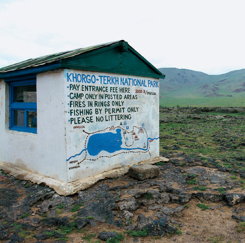 桥旁边有一座简易的活动屋,像是售票处,我们到时并无人值守。侧墙上画着特欣察干湖的示意图,有几行文字,要求每位进入国家公园的人购买3000图的门票。