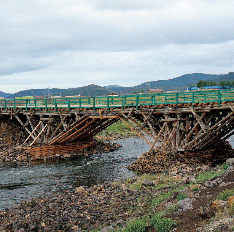 汽车沿着弯弯曲曲的楚鲁特河峡谷前行,进入国家公园地界——特欣察干湖。国家公园入口处在一座木桥旁边,溪流并不很宽。车停之后,嘎那与钢巴抬着那个曾经煮石块羊肉的罐,下河取水。上坡时,他们一前一后,后面人搭着前人的肩膀。