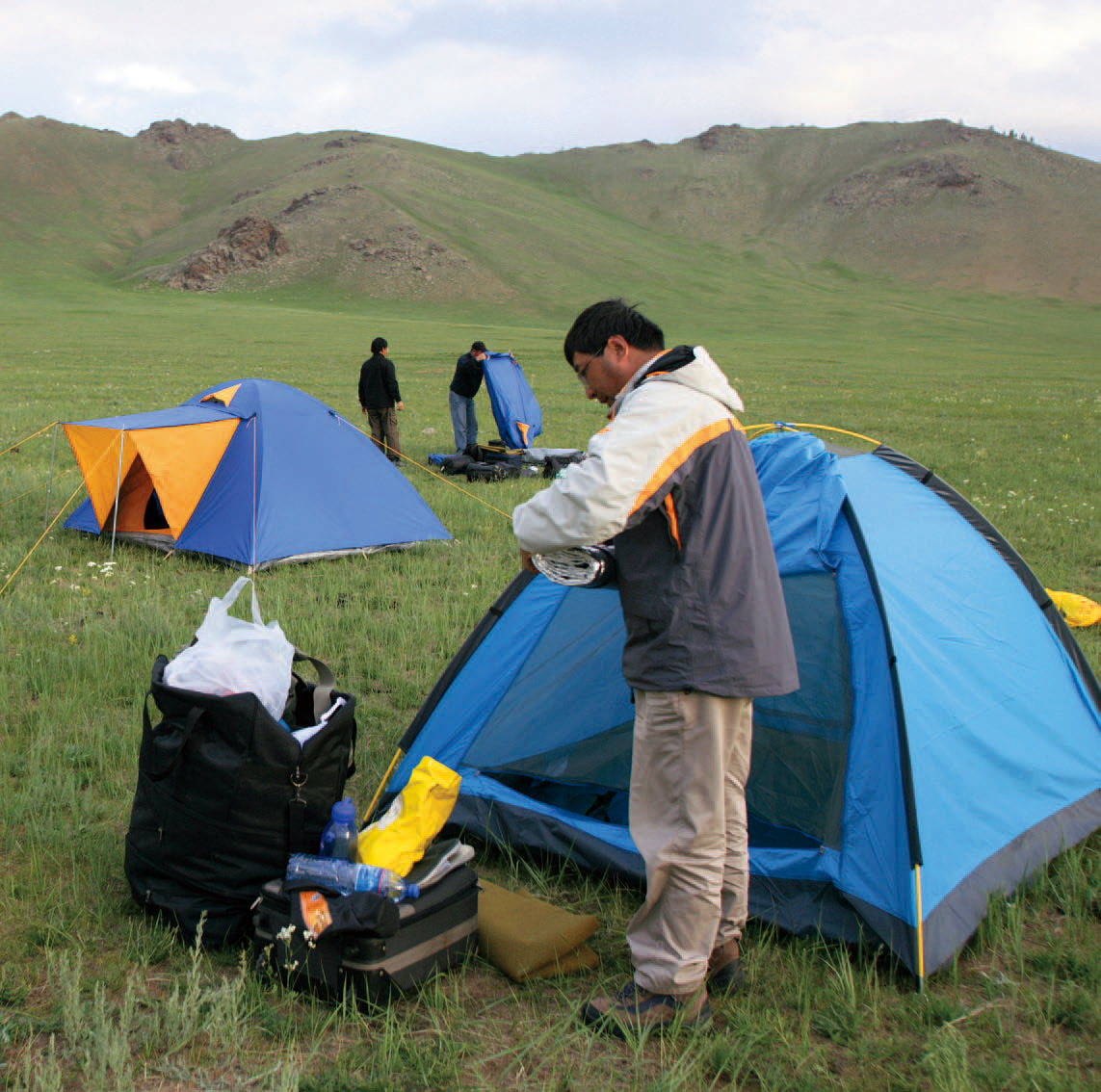 我虽号称经常在野外,却没有住过野外帐篷。在靠近罗新、李肖帐篷的地方,卸下行李包,拿出帐篷。没有搭帐篷的经验,只能先看旁人怎么搭,自己再照猫画虎。搭帐篷也有点讲究,主杆要从门两侧交叉方向穿过,形成十字交叉,杆子全部穿完后,才能将两杆同时拱起,然后用绳子将四角固定,钉上防风钉。这样,帐篷才不会被风吹起。我用的是一单层帐篷,罗新戏称,是城市人郊游的情侣帐篷。它根本不适合专业野外考察,虽然号称面料是防水布,实际上经不起雨淋,时间一长,雨水会沿着布缝浸入。在李肖帮助下,我也完成了帐篷搭建。
