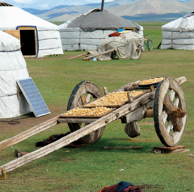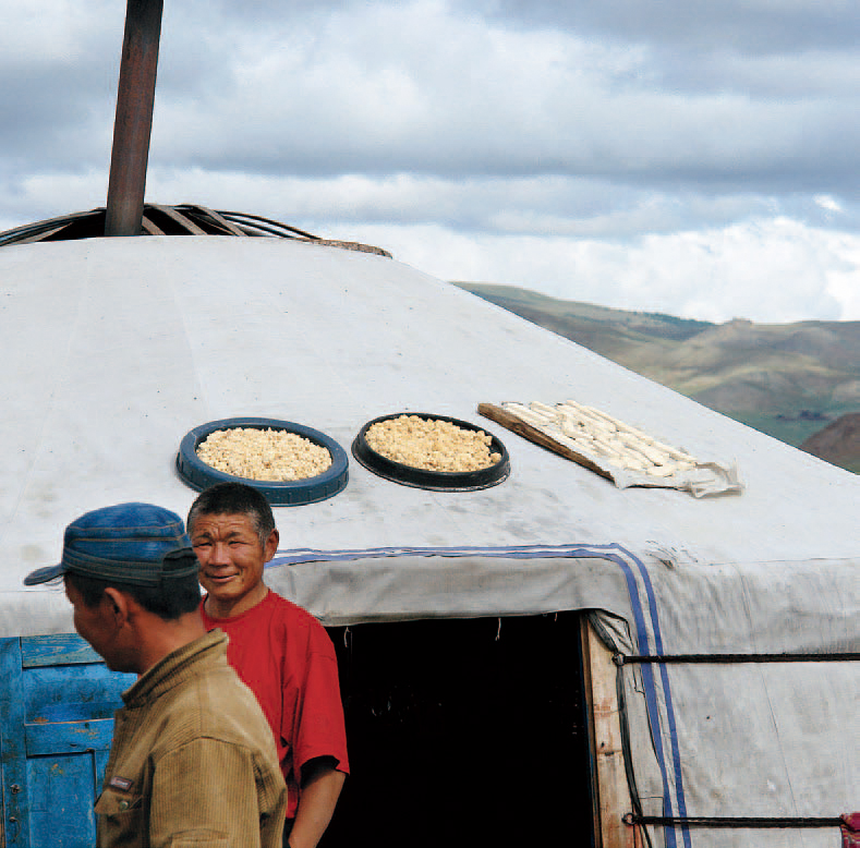 途中,我们的车在一家蒙古包前停留片刻。这家人有四五顶蒙古包,木制拉车上及包顶上都晒着一盘盘奶疙瘩。夏季,是游牧人的奶季。蒙古人要利用牲畜产乳的时机,大量挤奶,将奶在锅中煮沸、发酵,制成酸奶,最后制成酸奶疙瘩。经过晾晒、储藏,备用。在人们印象中,游牧人以食肉为生,其实是一个美好的误会。很长的时段中,游牧人赖以为生的食物,就是酸奶疙瘩。漫长的冬季,游牧人就靠吃它度过。
