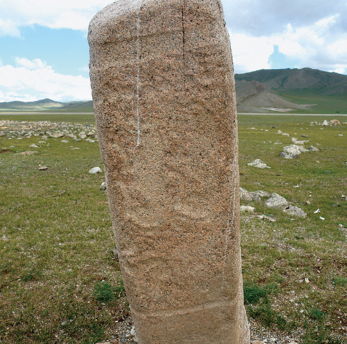 鹿石,方柱状,径25厘米×33厘米,高133厘米,底部围几块石头。鹿石顶部、下部磨出一周槽,凹槽之间,磨刻着卷曲的鹿角,不过鹿的身体部分看不大清楚。图案是用敲击、磨刻的方法制成,看不到运用工具的痕迹。鹿石与石圈属于同一时代,它是墓葬地面标志性遗物,一般推测这类鹿石属于早期青铜时代。