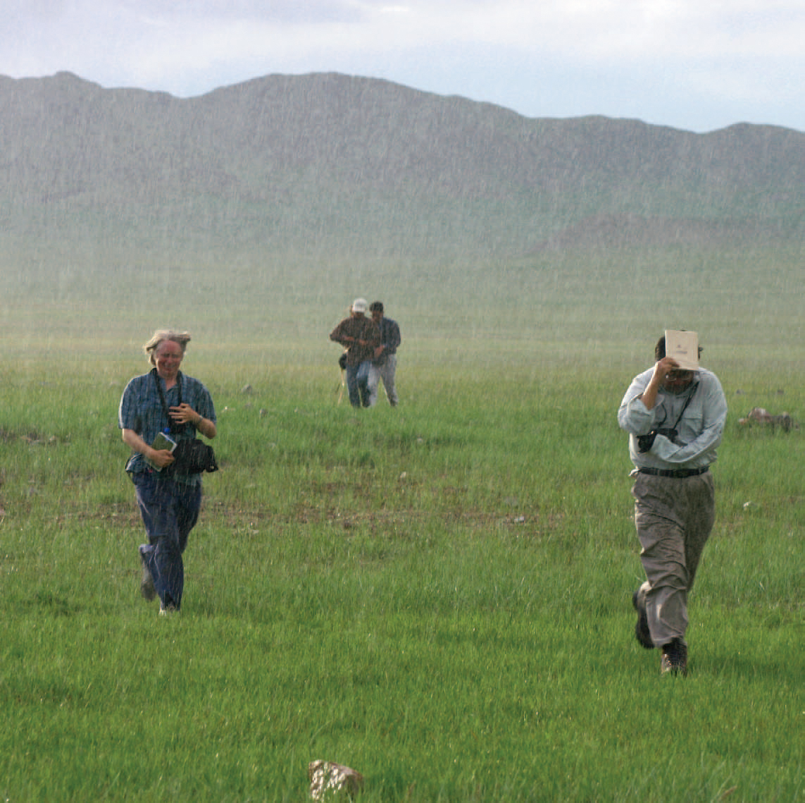 正在胡须墓测量时,天空顿时乌云密布,在紧张地聚集,慢慢压过。开始,雨点很大,零星落下,随着密度加大,石头上的雨滴渐渐连成一片。等我们四散跑入车中时,如注的大雨已将整个草原变成一片水幕,个个都成了落汤鸡。