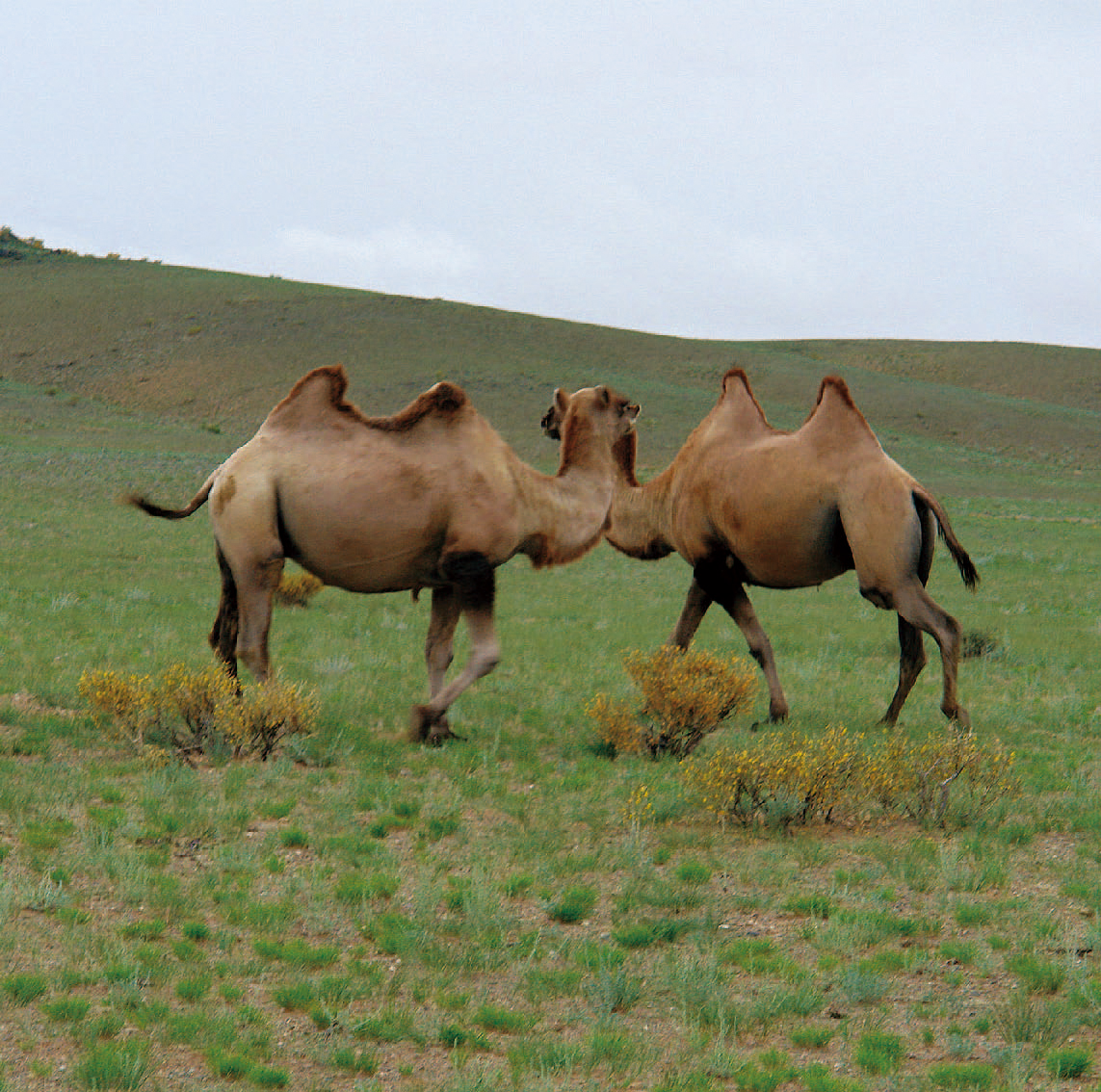 汽车沿河谷公路行进,路旁景色没有什么变化,草原一眼望不到边,植被虽然绿茵依旧,但明显稀疏,有的地方已露出地皮。本有点倦意的我,随着汽车的颠簸,在似睡非睡中度过。“骆驼!”坐在前排李肖的叫声惊醒了我。路边有一群骆驼,正在吃草。有十来只,其中有几只骆驼毛呈白色,白骆驼,很少见。停车,拍照。面对着一大群不速之客的长枪短炮,驼群并无惧色,仍然埋头吃草,偶尔抬头望来。只是有人靠得太近,它们才慢慢跑开。有几头还穿过公路,跑向另一侧。能饲养骆驼的地方一般都靠近荒漠草原,骆驼附近并没有牧人出现。草原上放养骆驼,一连几天并不用赶回。与其他牲畜不一样,骆驼并不需要每天饮水,马、牛、羊则每天都喝水,所以放牧地一定要靠近水源,骆驼一连几天不喝水,照样行走如飞。