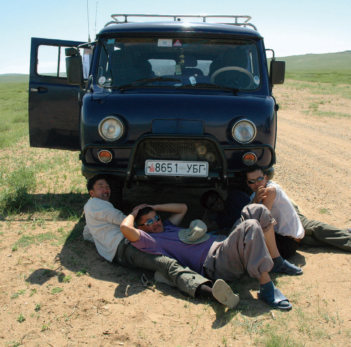 汽车需要随时检修,看,嘎那又趴在车下,蒙古的司机大概是最辛苦的职业,旅途中的任何车辆故障,都要自行修理,从不假手他人,这点像六七十年代的中国司机。荒郊野林,不着村店,只能自己练就一身过硬的本领,才能对付俄制普罗钢。