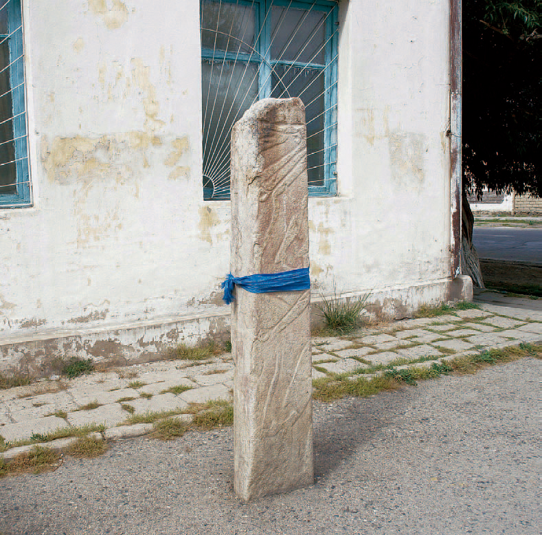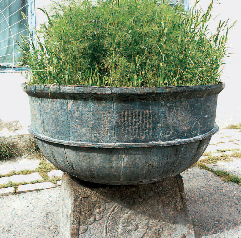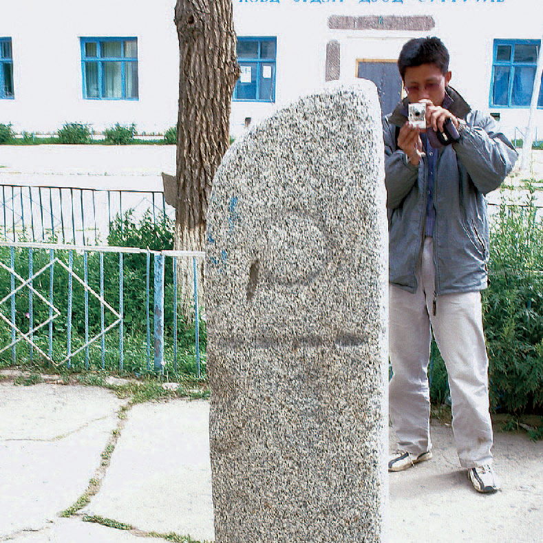 进入市区之后,我们直奔科布多省博物馆。省博物馆设在一幢二层小楼中,门口左右各竖立着一灰色花岗岩的鹿石。左侧鹿石,上部太阳的图案清晰可辨,下面鹿的形象已漫漶不清。右侧石,中央系一条蓝色的哈达,自上而下有三只鹿飞奔。鹿石边上各有一圆形大铜釜,铜釜内种植茂盛的绿草。放置铜釜的底座石,砂石岩质,似乎有些年份。铜釜上满布铭文,可惜匆匆进入博物馆,未及细看,以为出来会有机会仔细观察。