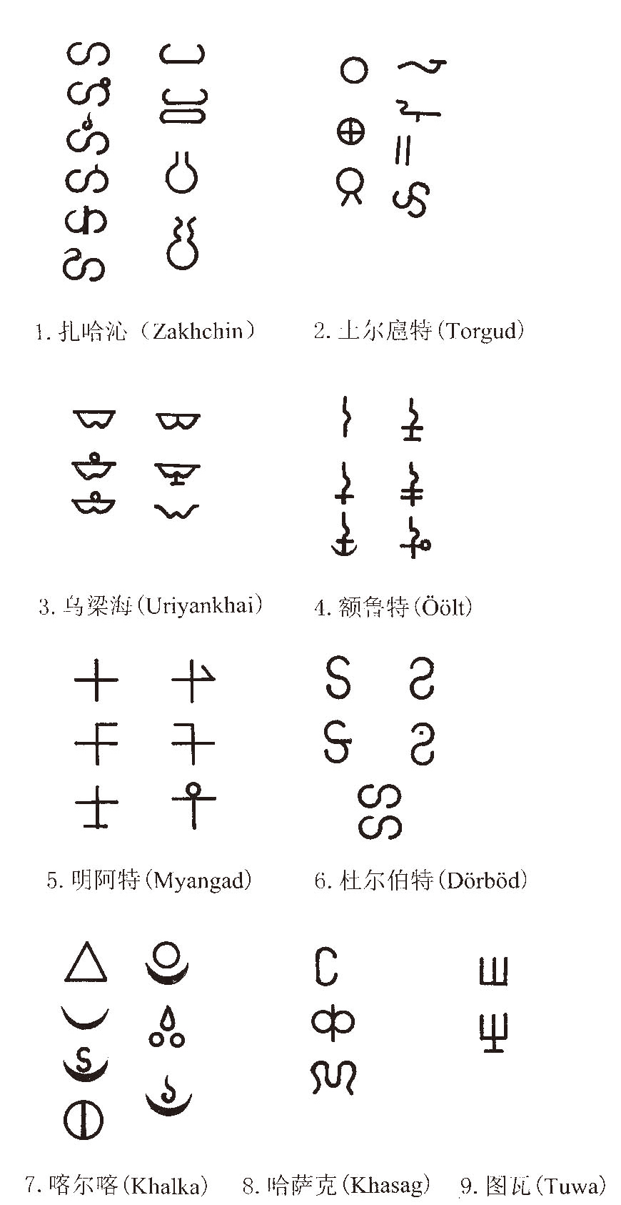 有一个展柜展示蒙古人用来烙马印的铁印,共有三件,其中一件铸有汉文“天”字。上面有一个图板,绘制着科布多地区蒙古部落的马印图案,共有九个部落。扎哈沁(Zakhchin)部10个,马印是以平置的S形为基础,在S形的部位加上一小点或一竖、一横等成为另一部落的印记,表明他们共处于一个大部落的共治下。另一组以图形为基础,构成小部落的马印。从马印上分析,扎哈沁部原本是由两组较大的部落群组成。土尔扈特(Torgud)部有7个。有一个是圆形,另一个是圆形中间加十字。乌梁海(Uriyankhai)有6个,以弓箭为图形,马印表明它们的构成比较单一。额鲁特(Öölt)有6个,展柜中的一个烙印,似乎与其中一个近似。明阿特(Myangad)部有6个,基础图形是十字。杜尔伯特(Dörböd)部6个,有4个竖立的S形,2个平置的S形,与扎哈沁部落马印有些重复。喀尔喀(Khalka)部有7个,其中4个与半月有关,半月形上有圆形、S形等,也有三角形,三角滴水形等。哈萨克(Khasag)部3个,图瓦(Tuwa)只有2个。