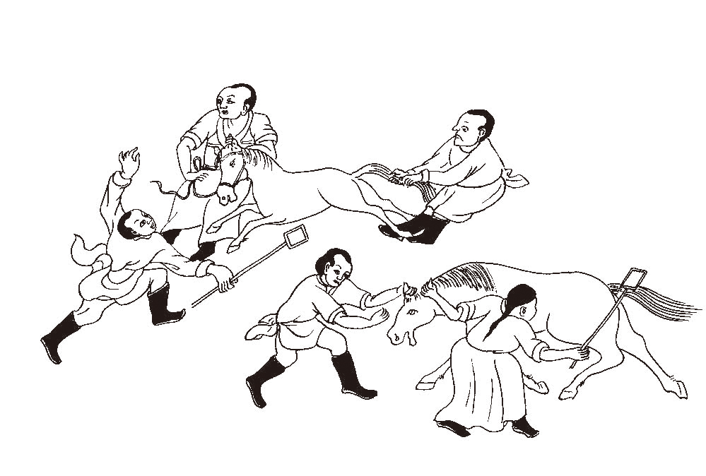 牲畜是游牧人社会的重要资产,它们的相似度很大,用标记识别,成为区隔畜群的普遍行为。在大牲畜尤其是马匹身上烙印,是部落间分别彼此的标志。烙印会使用专门的铁印,像展柜中看到的一样,图案直径3—5厘米,后端有一个七八十厘米的握柄。蒙古风俗图上描绘的烙印过程,先将铁印在火中烧成合适的温度,将马匹按头在地,一人拉住缰绳,控制马头,一人抓住马尾巴,执印人对准特定部位,烙印,晚期烙印的部位主要在臀部。图案要经过特别的设计,以利于区别,一般由大的上级部落制定,他们掌握大范围内的印记使用情况,避免重复,向小的部落颁发。当然也要遵循部落既有的传统。