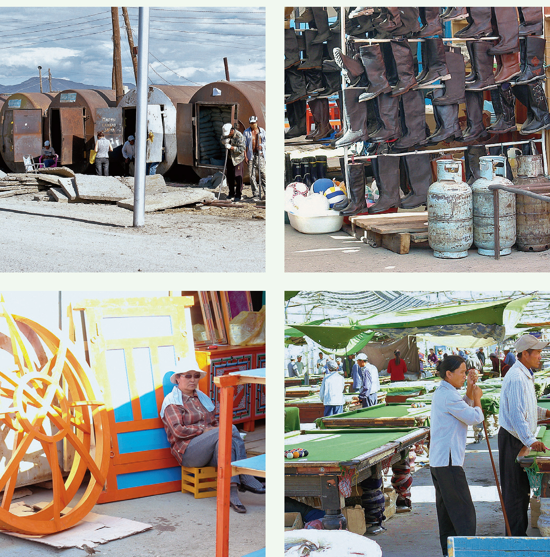 每个集装箱或油罐筒都是一个独立的摊位,门前多扯起彩条布遮阳。台面上摆放着各式各样日杂百货,大部分是从中国进口。大家和我的想法一样,看看有什么能买的蒙古玩意儿,好把剩余的蒙古图花出去。转过几条店铺街,失望之感顿生,蒙古生产的东西,除了蒙古皮靴之外,剩下的就是蒙古包了。廉价的中国商品在大家面前晃过之后,大家想法很一致,没有必要浪费更多的时间。摊位个个相连,过道狭窄。蒙古地域辽阔,集市却如此狭仄,让人费解。