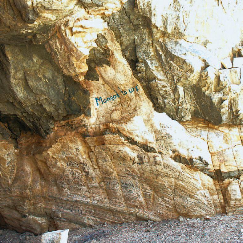 原路返回,出山的路的尽头,停车。路边山崖上有岩画。大家一拥而上,岩石上刻凿着山羊、鹿。