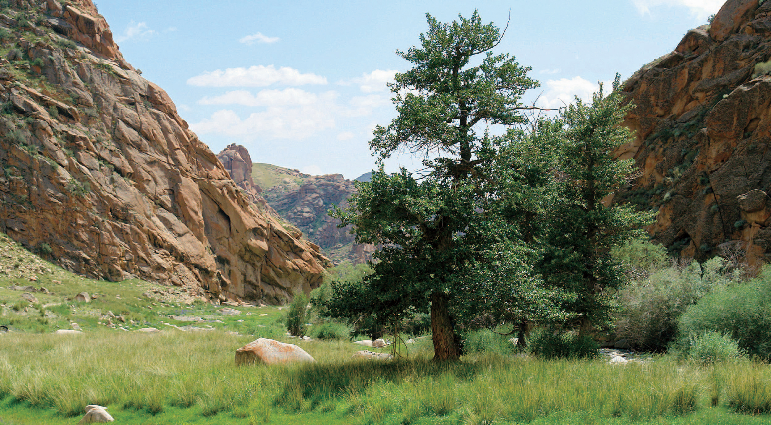 路从河流的左边移向右侧,右岸比左岸宽出许多,沿河床生长着低矮的灌木,一丛一丛,乔木则靠边一些,峡谷坡面上则没有树木,有的地方连草也不长。