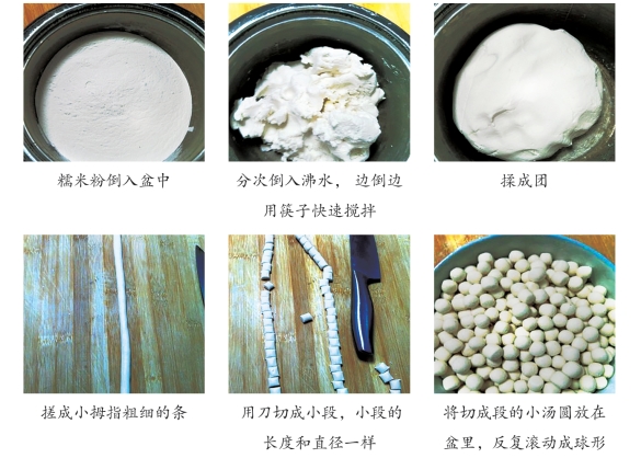 生粉团的类型繁多,其中小汤圆是日常生活中较常见的生粉团。学习小汤圆是学生学习其他生粉团的基础,同时也能够让学生掌握“烫制”的成团技法。通过对小汤圆的学习,学生可以举一反三,制作“雨花石汤圆”“青团”等制品。