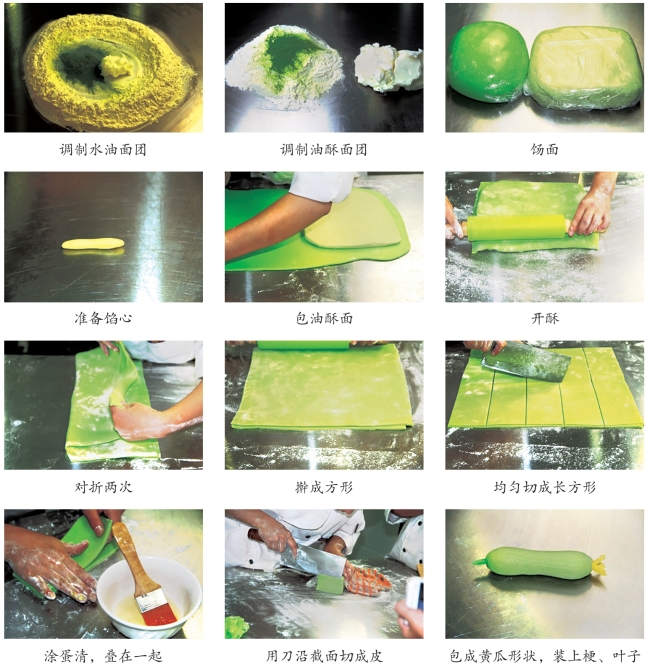 黄瓜酥是根据油酥面团的起酥原理,利用排酥的开酥方法,制作出的口感酥脆、颜色亮丽、造型新颖的一款创新面点。