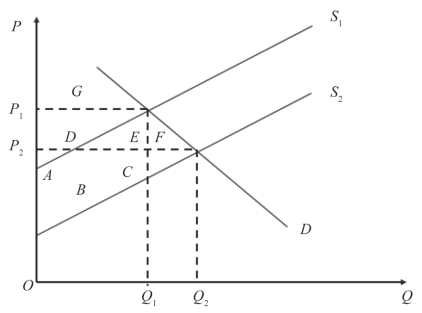 科学研究可能带来单位产品成本下降或生产力提高,使供给曲线发生移动,消费者剩余和生产者剩余发生变化,对这种变化进行分析,就可以使用剩余分析法。假定采用生物技术成果后供给曲线从S1移动到S2,那么均衡价格、产量将由(P1,Q1)变为(P2,Q2)。S1时,生产者剩余为A+D,消费者剩余为G,社会总剩余为A+D+G;S2时,生产者剩余为A+B+C,消费者剩余为D+E+F+G,社会总剩余为A+B+C+D+E+F+G。从S1到S2,社会总剩余的净增加值为(A+B+C+D+E+F+G)-(A+D+G)=B+C+E+F。研究中,在极为不同的条件下,对供给和需求曲线的形状与移动作了大量的假设。使用剩余分析法对生物技术科研投资的收益进行评估,收益评估值的大小存在差异,虽然有些很小,但生物技术科研投资能够获得收益这一点是毫无疑问的。通过对生物技术科研投资所进行的上述收益分析,可以得出以下结论:生物技术科研投入的社会效益较高,追加公共、私人投资可以促进社会福利的增长。经验表明,到目前为止,公共部门、私人部门的联合行动比任何两者独立的行动都更富有效率。