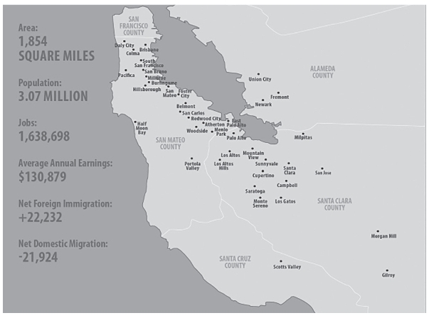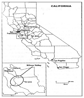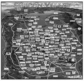 硅谷发展到现在,其地域也在逐渐扩大。从20世纪50年代的斯坦福工业园开始,呈带状逐步扩展。从1992年的硅谷地图(图4)来看,当时的硅谷主要集中在圣何塞、圣弗朗西斯科及奥克兰之间的地带。但自2009年以来,在每年发布的硅谷指数中,硅谷包括圣克拉拉、圣马特奥和圣克鲁斯三大区域。具体包括:圣克拉拉的坎贝尔、丘珀蒂诺、吉尔罗伊、洛斯阿尔托斯、洛斯拉图斯、洛斯盖多斯(镇)、米尔皮塔斯、蒙塞瑞诺、摩根希尔、芒廷维尤、帕罗奥图、圣何塞、圣克拉拉、萨拉托加、森尼韦尔等地,阿拉米达的弗里蒙特、纽瓦克及尤宁城等城市,圣马特奥县的阿瑟顿、贝尔蒙特、布里斯班、布罗德莫尔、伯灵格姆、戴利城、东帕洛阿尔托、福斯特城、半月湾、希尔斯伯勒、门洛帕克市、米尔布雷、波托拉瓦利、雷德伍德城、圣布鲁诺、圣卡洛斯、圣马特奥、南圣弗朗西斯科、伍德赛德等地,圣克鲁斯的斯科茨谷等地。