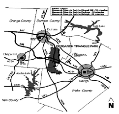 北卡三角园于1959年成立,是美国最大的科技园区,占地约28平方公里,其中未开发区域面积约4.5平方公里。RTP毗邻北卡罗来纳州的罗利(Raleigh)、达勒姆(Durham)和教堂山(Chapel Hill),处在三座城市夹成的三角研究区域中。除了一小块区域延伸入维克县(Wake County),三角研究园的大部分土地都在达勒姆县的行政区域内。园区被北卡罗来纳大学、北卡罗来纳州立大学和杜克大学三所名校环绕,从园区到上述任何一个城市、任何一所大学以及当地机场,驱车行程都不超过半小时。研究园的东北面和西南面各有一个湖泊,自然风光优美。经过精心细致的规划和设计,三角园里草坪连片、绿树成荫,许多地方如河流、湖泊、山丘都保留了原始风貌,体现出人与自然和谐相处的科学精神。每座建筑物与周边其他建筑和自然景观均形成随景就势的最佳搭配,各具特色的建筑物造型与地形地貌相辅相成、融为一体。1994年,三角园还被美国《财富》杂志评为“全美最佳生活居住区”。