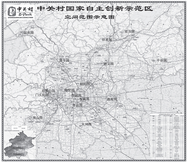 2009年3月13日,国务院发布《关于同意支持中关村科技园区建设国家自主创新示范区的批复》,明确中关村科技园区的新定位是国家自主创新示范区,目标是成为具有全球影响力的科技创新中心。2010年12月23日,北京市十三届人大常委会第二十二次会议表决通过《中关村国家自主创新示范区条例》。该条例明确规定:“中关村国家自主创新示范区由海淀园、丰台园、昌平园、电子城、亦庄园、德胜园、石景山园、雍和园、通州园、大兴生物医药产业基地以及市人民政府根据国务院批准划定的其他区域等多园构成。”2012年10月13日,国务院批复同意调整中关村国家自主创新示范区空间规模和布局,由原来的“一区十园”增加为“一区十六园”,包括东城园、西城园、朝阳园、海淀园、丰台园、石景山园、门头沟园、房山园、通州园、顺义园、大兴园、昌平园、平谷园、怀柔园、密云园、延庆园等园区。