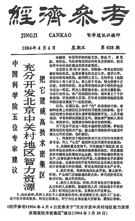 在这一阶段,《经济参考》1984年4月4日发表了题为《充分开发中关村地区智力资源,把它建成高技术密集区》的通讯(见图21)。通讯中提到,中科院赵文彦、陈益升、柳怀祖、唐世耀与马幼芬等五位专家明确建议将中关村地区建成高技术密集区。