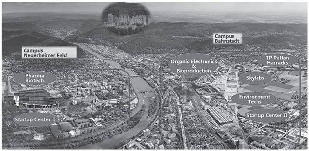 1984年,在园区建设同期,Michael Paulista在此创办了生物技术公司,开启了生物医药产业在海德堡发展的先河。1995年,为了推动高科技企业落地,尤其是生物医药产业的发展,由海德堡当地的大学、研究机构、市政府和商会等共同组建了单一的协会,设立了规模为5000万马克的产业引导基金,支持在海德堡尤其是园区的研发。同期,BASF[144]、Merck[145]以及Boehringer Mannheim[146]等一批国际知名企业的项目纷纷在此落地。从2000年开始,园区大力推动项目孵化,专门设立了孵化器;到2012年,园区经过了三次大规模的园区扩建,以Octapharma AG[147]为代表的一批国际企业的研发中心纷纷在园区设立。2017年,在当地政府支持下,园区继续扩建,并把新建区域主要用于支持中小企业的发展上,并为此不断制定和完善相关支持政策。