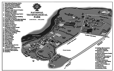 爱尔兰国家科技园位于爱尔兰西部,距爱尔兰首都都柏林200多公里,是爱尔兰第一个国家级科技园区。园区于1984年开始建设,占地2.6平方公里,电子信息技术、材料和电子商务是园区主要的发展产业。园区吸引跨国公司入驻,利用本地人才进行本地化,促成爱尔兰本土公司的建立和发展,同时使企业与教育和科研机构、企业与企业之间建立起密切联系的纽带,为高新技术企业的建立和发展提供必要的中介和孵化服务。